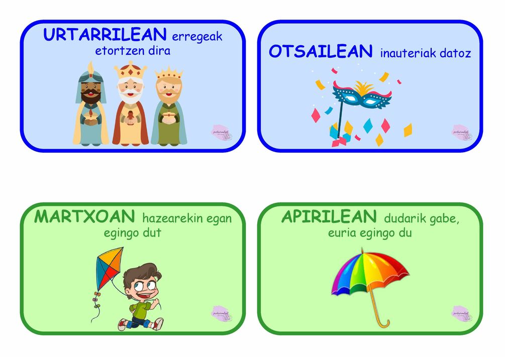 Gaur gure urteko hilabateak lantzeko txartelak ekartzen dizkizuet. Bakoitza esaldi batera lotuta dago gogoratzeko erraza izan dadin.🥰🥰